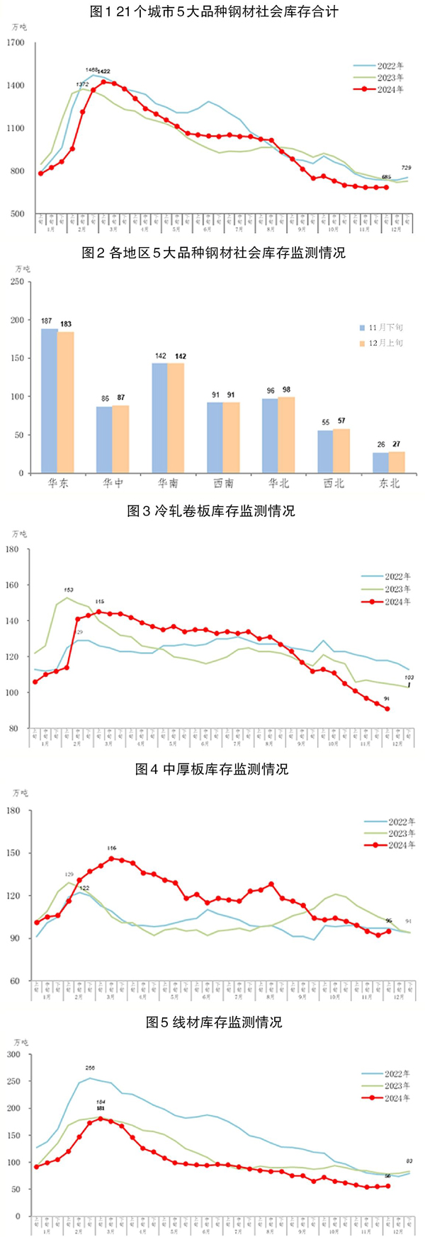 12月上旬,21个城市5大品种钢材社会库存为685万吨,环比增加2万吨,上升0.3%,库存低位波动;比今年初减少44万吨,下降6.0%;比上年同期减少52万吨,下降7.1%。